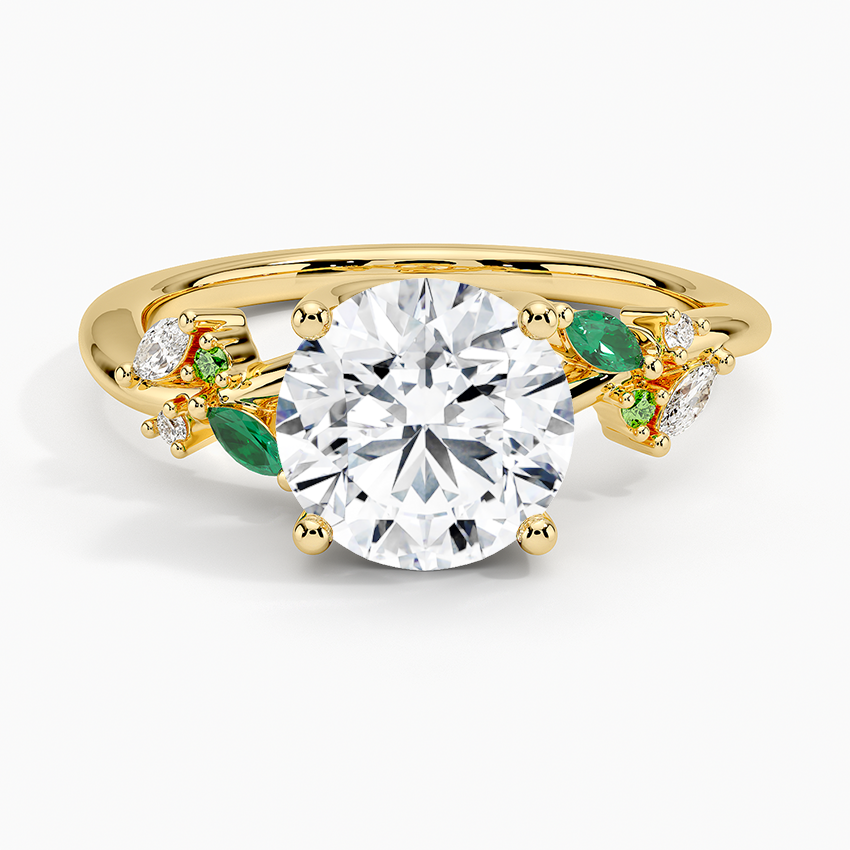 Budding round and marquise diamonds, lab grown emeralds, and green tsavorite garnets glimmer on each side of the center gem in this nature-inspired trellis ring (1/15 total carat weight).