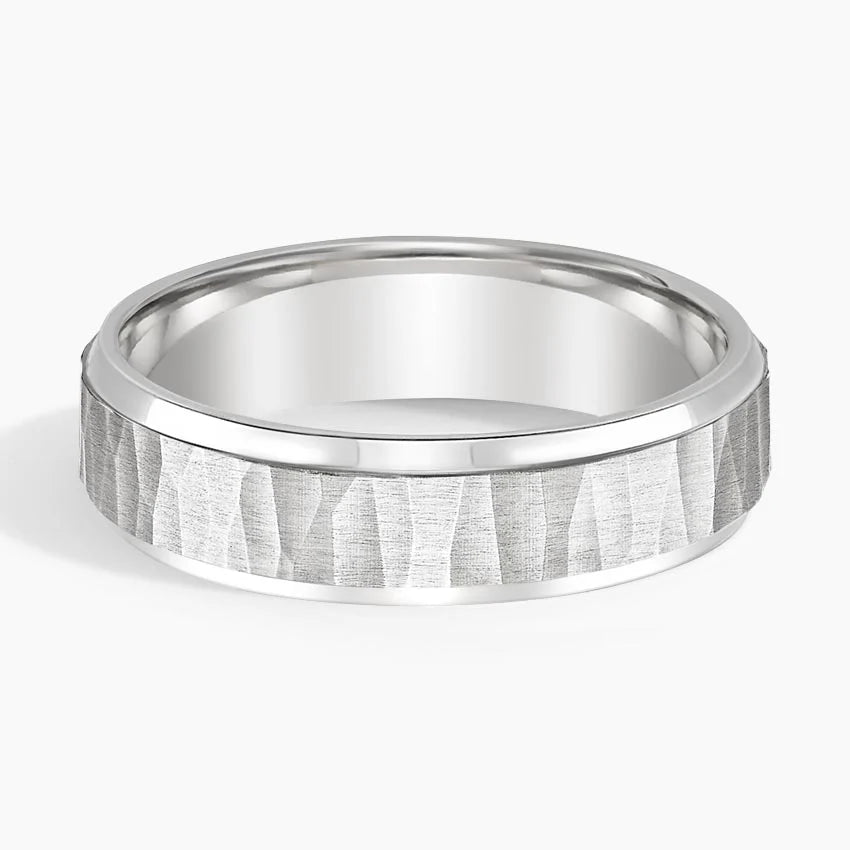 This wedding band features a matte finish and an organic texture reminiscent of an aspen tree. Handsome and modern, this band features a beveled edge that adds a classic element to a unique design.