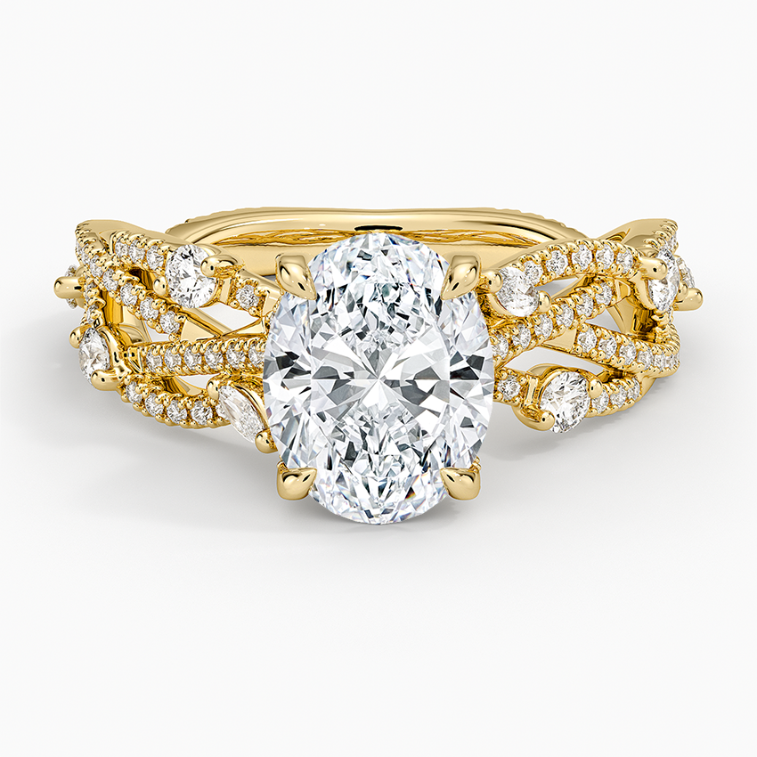 Designed in celebration of our 20th anniversary, this showstopping design features marquise and round diamonds in a vine-like pattern across three-quarters of the band. Classic claw prongs secure the shimmering center gem with a sleek finish (5/8 total carat weight).