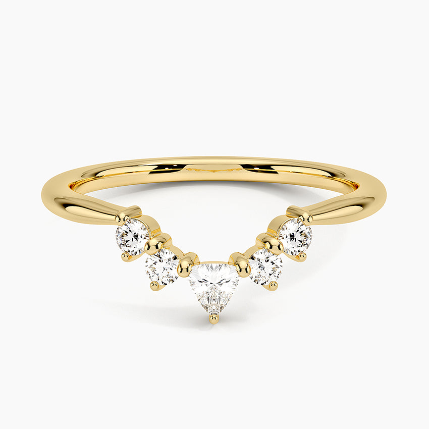 A unique trillion diamond rests at the center of a curved line of round diamonds in this contoured ring made to sit flush beneath many engagement ring styles (1/6 total carat weight).