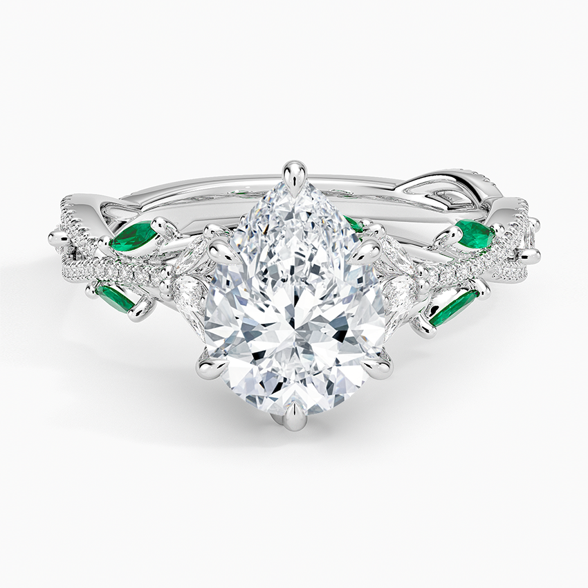 Glistening marquise-shaped lab emerald buds rest on whimsical vines of diamond-accented precious metal winding towards the center gem for a look of natural elegance (1/2 total carat weight).