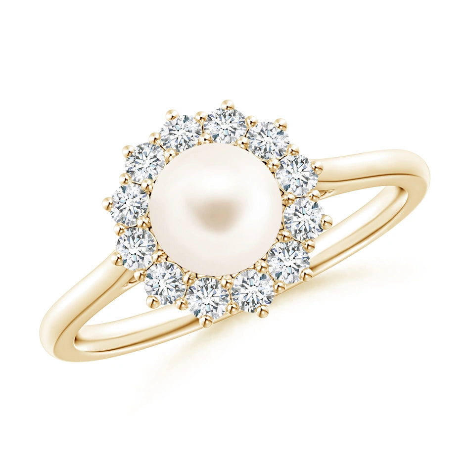 Evoking a feminine vibe with its floral design, this Princess Diana inspired pearl ring looks breathtaking. It is designed in 18k white gold. The Freshwater cultured pearl is illuminated by a scintillating halo of prong-set diamonds.