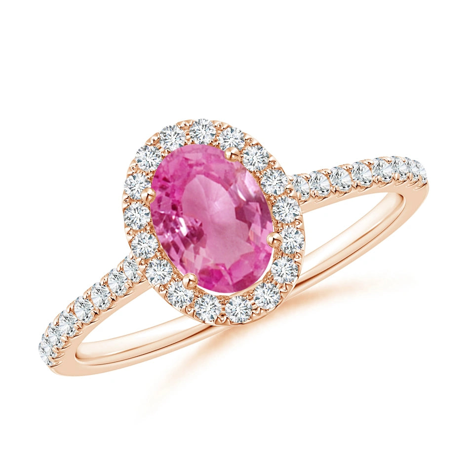 The oval pink sapphire in prong setting exudes an enchanting blossomy hue. Glimmering diamond accents encircle the pink center stone and adorn the shank for a luminous edge. This pink sapphire and diamond halo ring is designed in 14k rose gold.