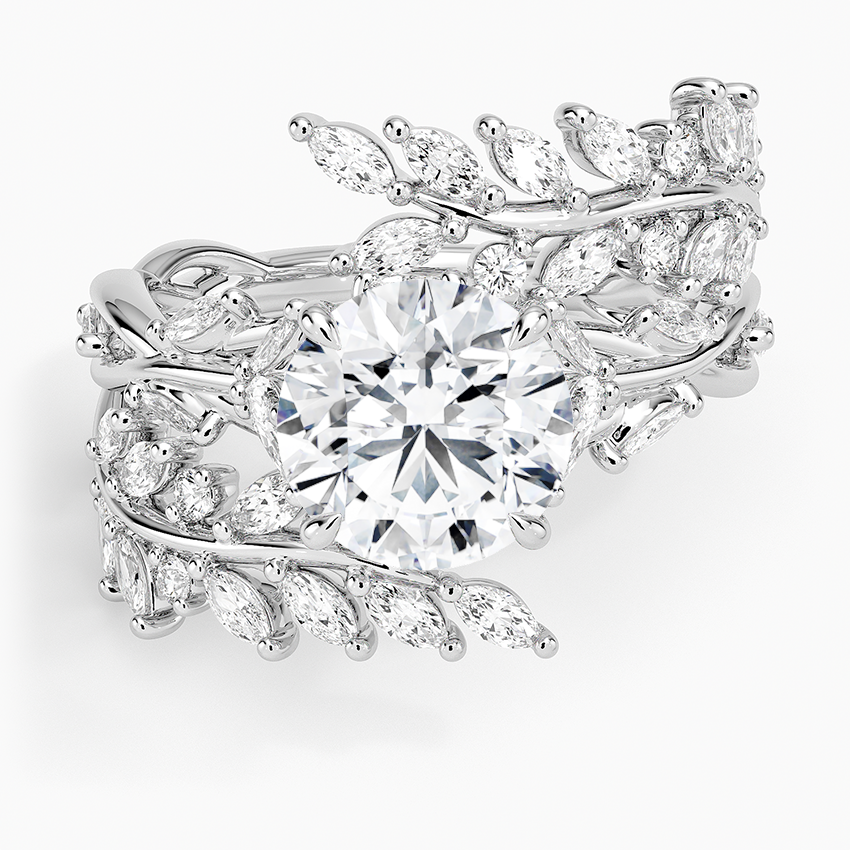Designed in celebration of our 20th anniversary, this showstopping engagement ring features marquise diamonds in a unique pattern that wraps above and beneath a center gem secured by claw prongs. Additional diamonds adorn the gallery for even more shimmer (1 1/3 total carat weight).