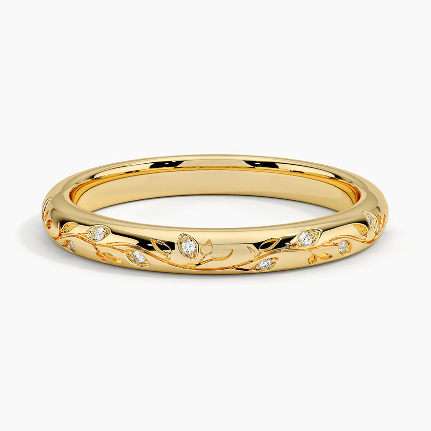 Diamonds adorn leaves and vines that are engraved across the entirety of this nature-inspired ring, adding elevated scenery to a simple band.